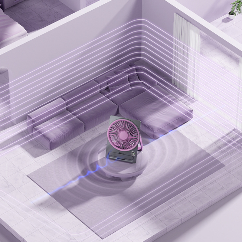 UTILISATION POLYVALENTE GRÂCE AUX OPTIONS DE SUSPENSION ET DE POSE: Ce ventilateur peut être suspendu ou placé sur une surface plane pour une utilisation facile. La fonction vent grand angle à 180° garantit que l'air frais atteint toutes les zones de la pièce, ne laissant aucun endroit intact. Que vous travailliez à votre bureau ou que vous l'accrochiez dans une tente, ce ventilateur assure un refroidissement continu et efficace sous tous les angles.